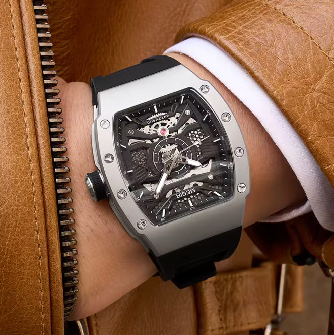 Un cadran entièrement ouvert, aucune fioriture. Les ponts sont fins comme des nervures de feuille. Le calibre automatique est modifié pour exposer chaque détail – du rotor à la vis centrale. Même l’aiguille des secondes est squelettée.