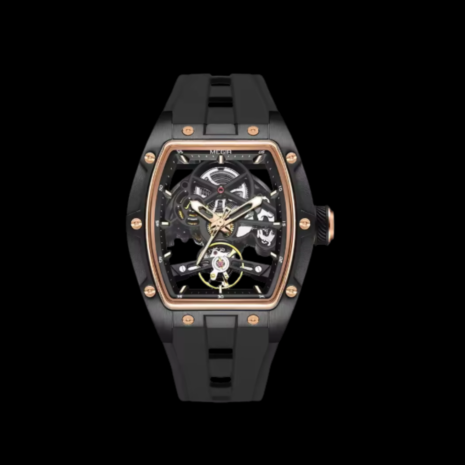 L’esthétique : Cadran profond, parsemé d’index luminescents qui rappellent des étoiles. Le boîtier est sombre, presque cosmique, contrasté par des reflets argentés comme une voie lactée miniature.